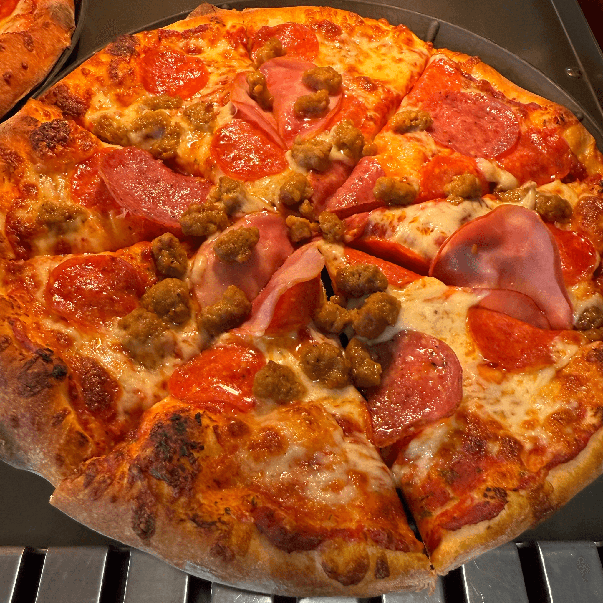Our meat pizza is topped with beef, Canadian bacon, Italian sausage, mozzarella, pepperoni, pizza sauce, salami