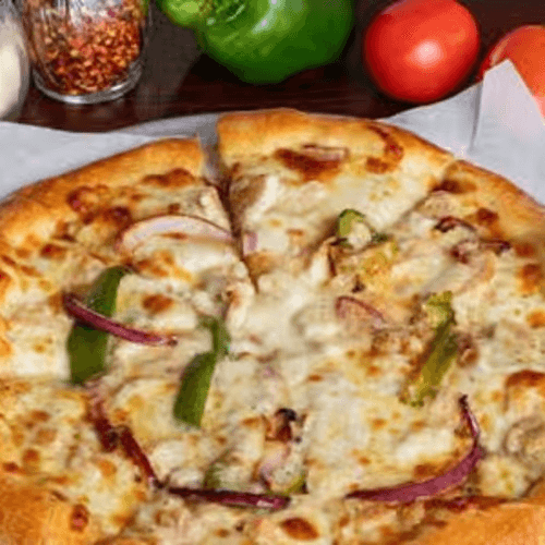 Our ranch rooster pizza is topped with chicken, green peppers, mozzarella, onions, white sauce